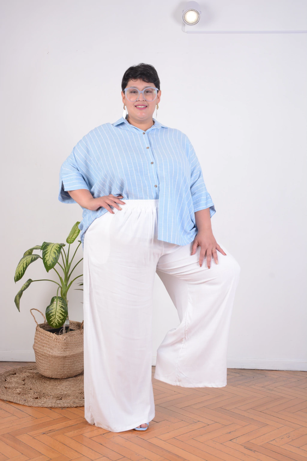 Lino con spandex. Tiene bolsillos. Es corte WIDE.