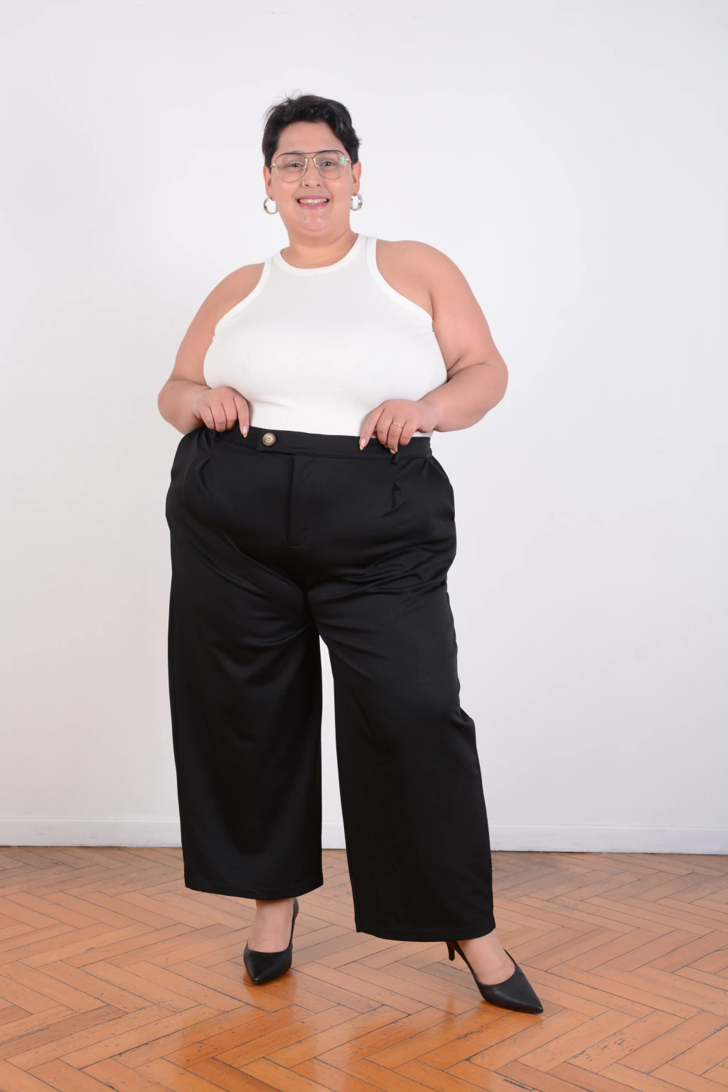 La cintura con elástico trasero brinda comodidad y adaptabilidad, mientras que el botón irregular delantero le da ese detalle distintivo que lo hace único. El largo capri deja ver el tobillo y suma un aire contemporáneo que estiliza.