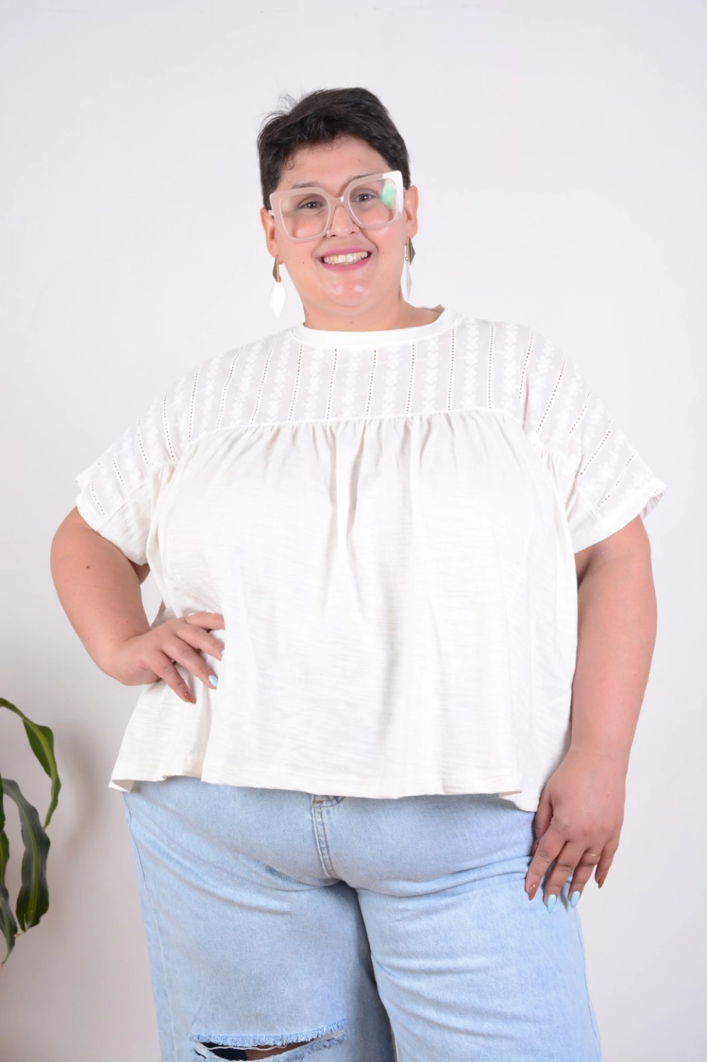 Remera oversized de algodón con bordado tipo broderie en el canesú y mangas, que le aporta textura y un aire romántico sin dejar de ser moderna. Tiene caída amplia, corte suelto y largo ideal para dar movimiento y frescura. Su tejido liviano la convierte en una prenda cómoda, respirable y perfecta para días calurosos. El escote redondeado suma delicadeza y la silueta evasé favorece sin marcar.
